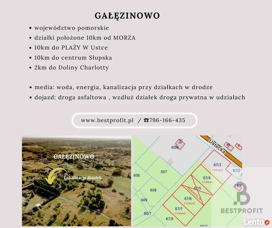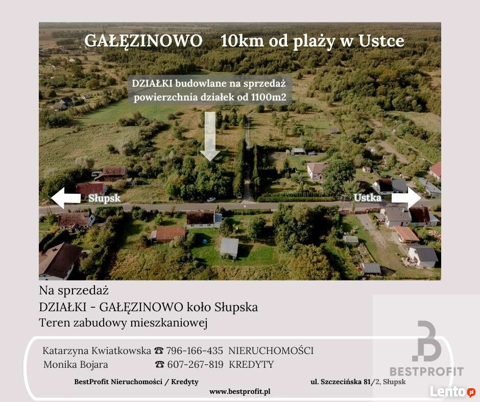 Na sprzedaż DZIAŁKA BUDOWLANA w Gałęzinowie pomiędzy Słupskiem i UstkaDziałka płaska, bez ogrodzenia o powierzchni 1100m2.